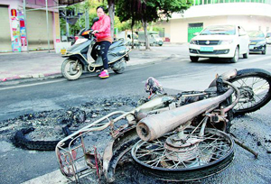 8时10分,记者赶到事发现场时,火已经被扑灭,只看到路面上倒着一辆两轮摩托车的残骸,但不见摩托车司机的身影。